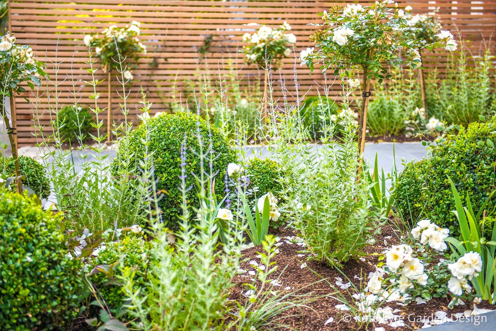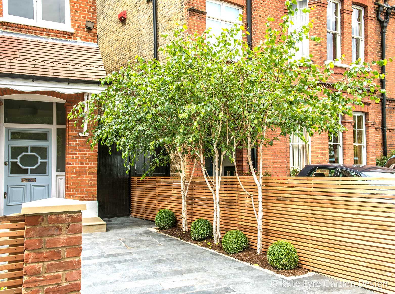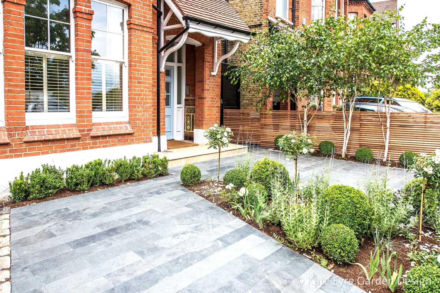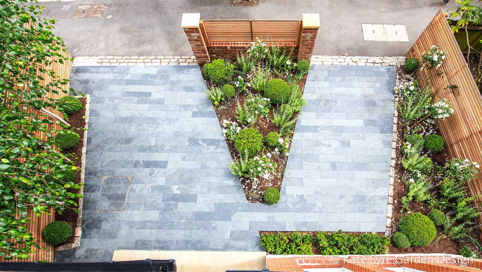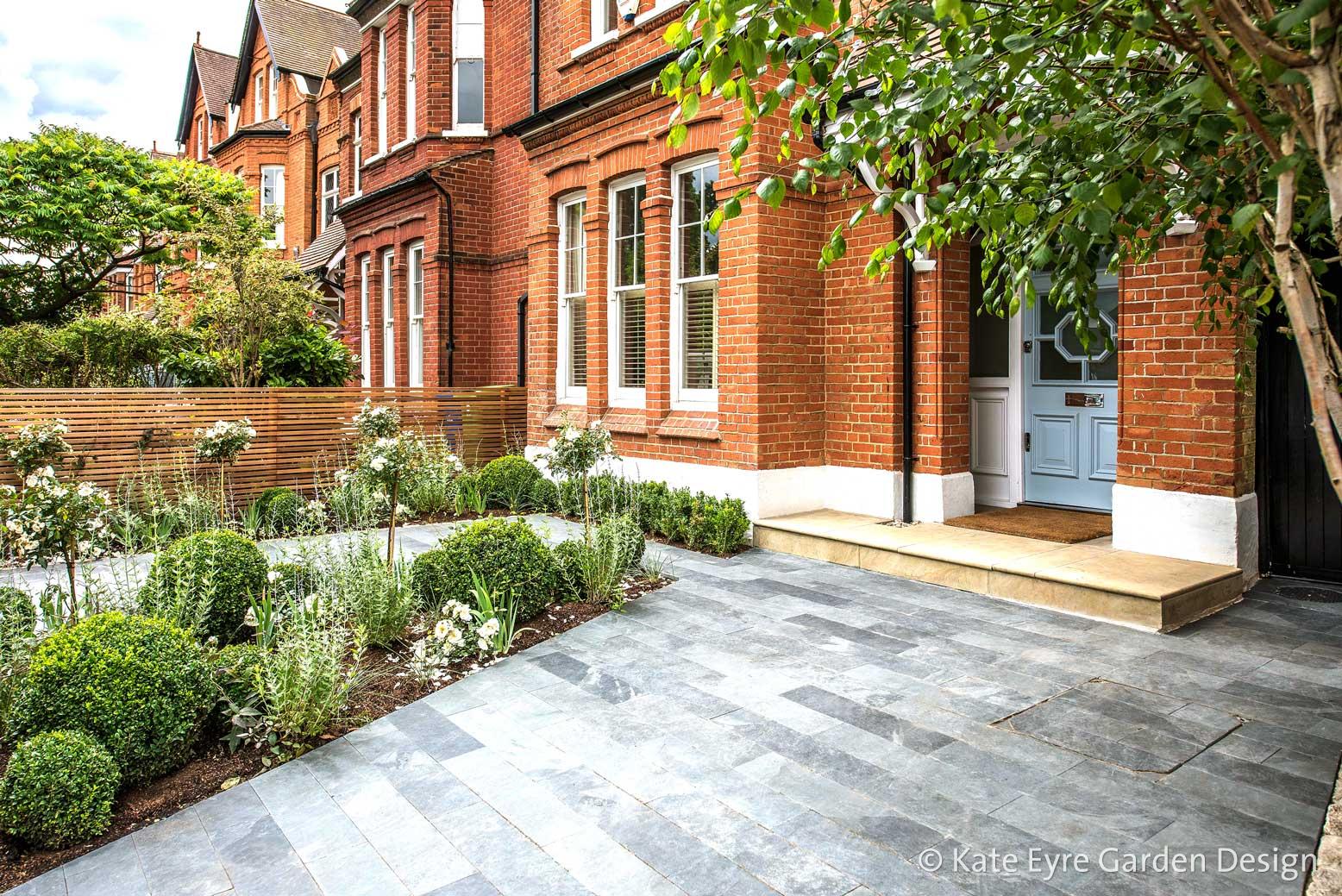 The surface laid in narrow slate paving forms two parking spaces divided by a triangular central planted area and a front wall of characterful reclaimed bricks. The fencing is built with our speciality bespoke red cedar battens, while the simple planting is a collection of buxus balls surrounded by roses and interspersed with tall perovskia blue spires and rambling blue and purple clematis.