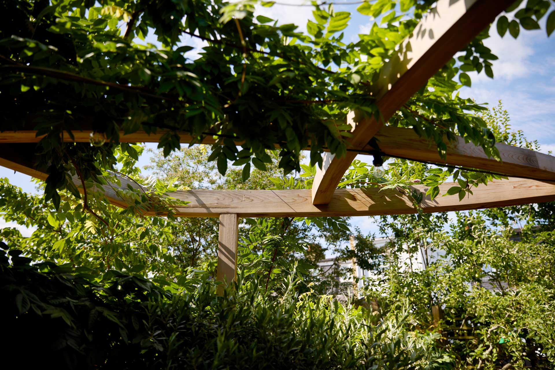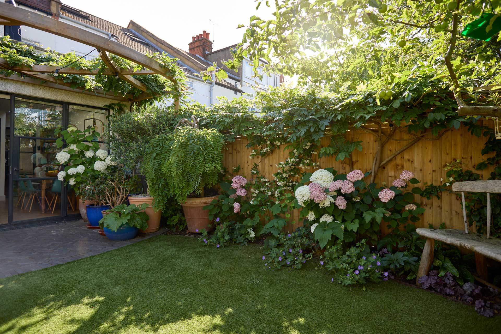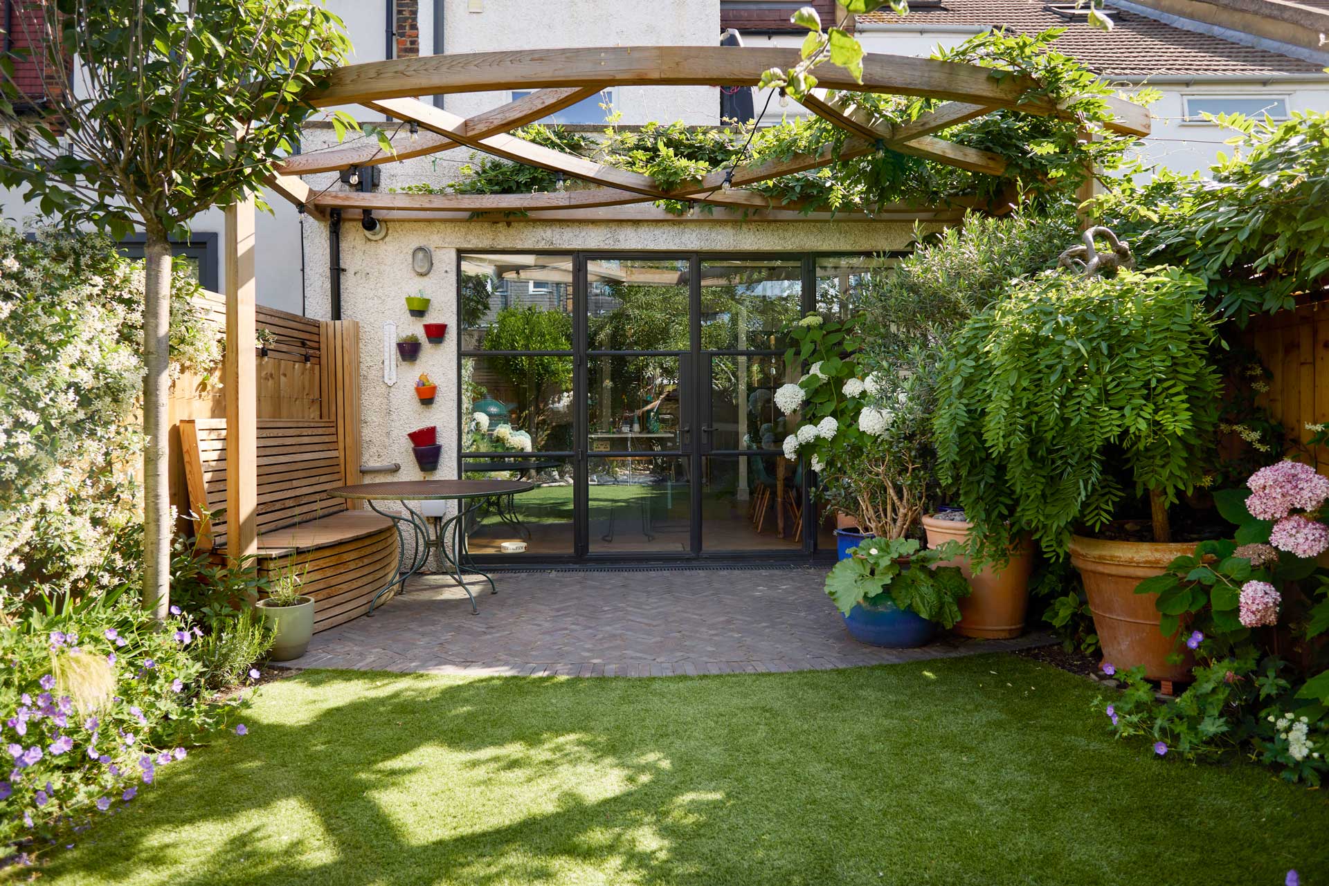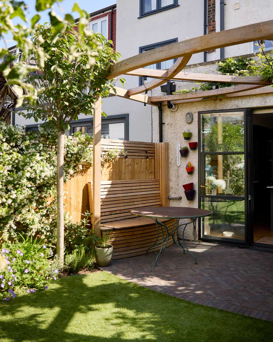 This intimate back garden in Herne Hill is a hidden urban gem, a sanctuary of calm and beauty amidst the bustle. At its heart, a breathtaking wisteria cascades gracefully, transformed into a stunning bespoke wooden pergola that crowns the patio like a living masterpiece.