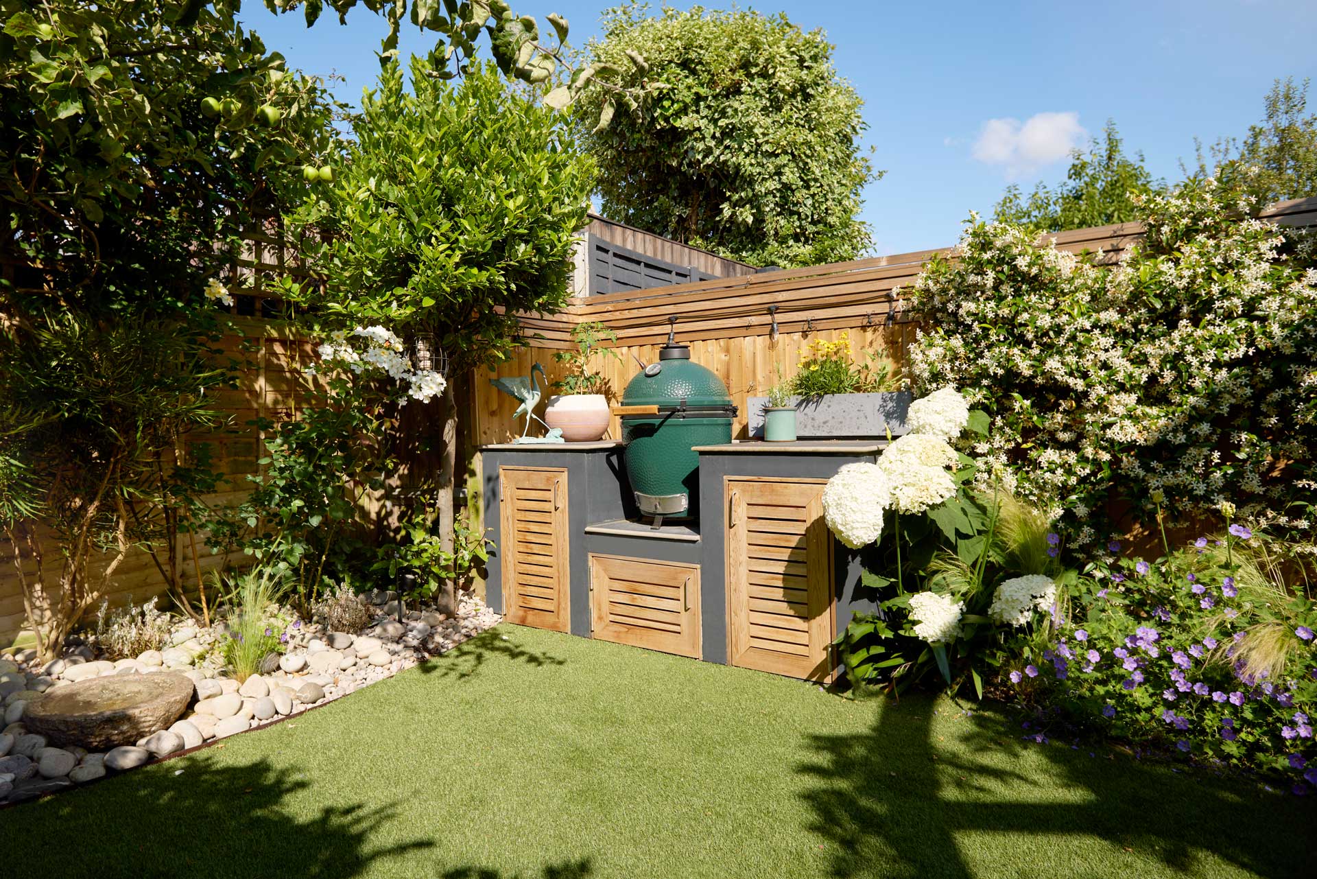 Beneath this enchanting canopy, a custom-designed storage bench offers the perfect retreat, a place to sit, relax, and soak in the tranquil atmosphere. A sleek, compact BBQ area invites effortless entertaining, while a gentle water feature whispers soothing melodies that soften the sounds of the city and elevate the garden’s peaceful ambiance.
